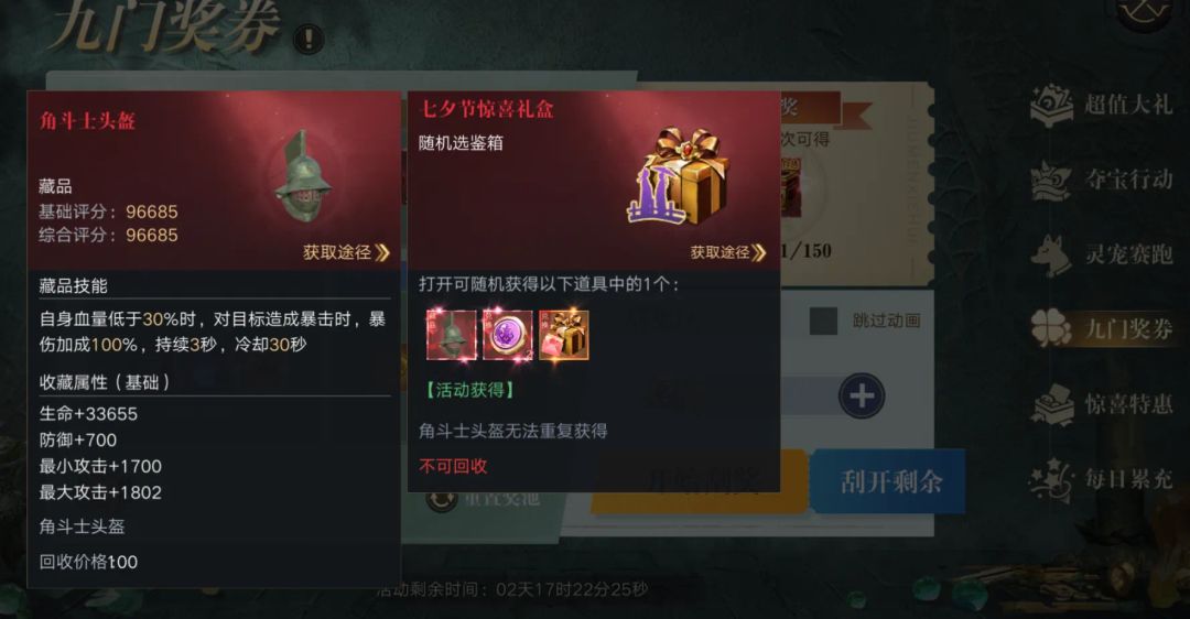 七夕节新藏品登场!一个奖池50个奖品,50抽必得七夕惊喜礼盒,有概率获得新藏品角斗士头盔!