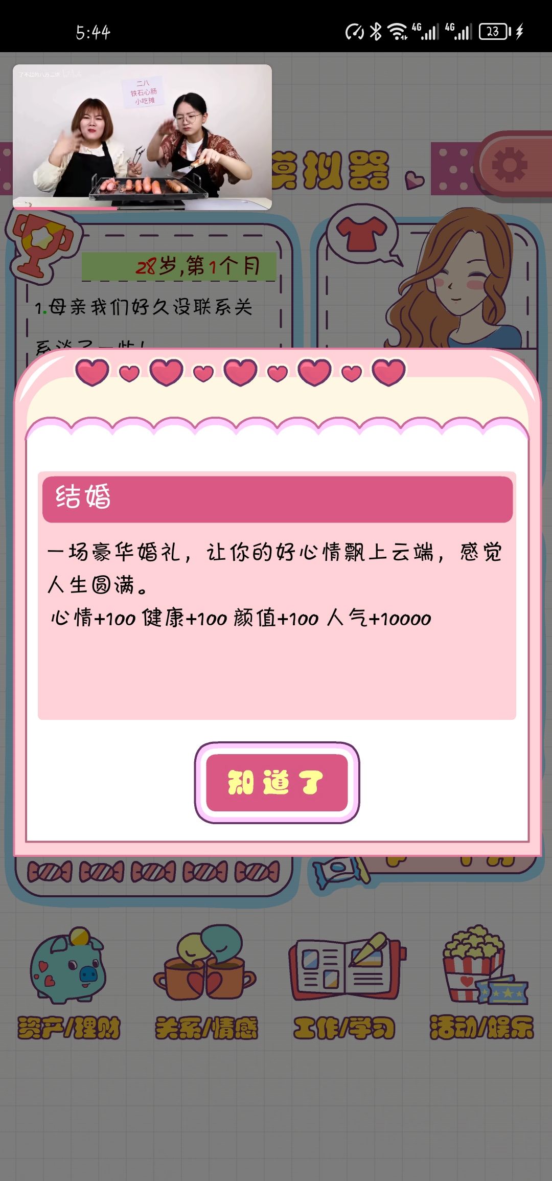 ⑤:可以抽时间和喜欢的人聊天,聊完天去约会,老顾好感100了,你就注意自己的健康就行,健康如果太低会强制停工一个月没有任何工资会自动跳过,后续你就工作,结婚,买房吧!!我现在只玩到了26岁