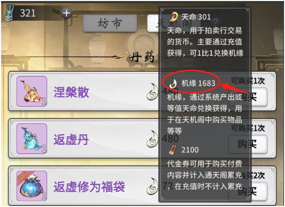 用来配合我们飞升后刷新天机阁商品,刷新一次可购买3个蓝色道法果,一个可以闭关3小时,13次可以闭关117个小时,包括突破大境界会刷新一次,刚好13个天机令,用机缘刷新天机阁性价比不高,所以我们要存天机令。