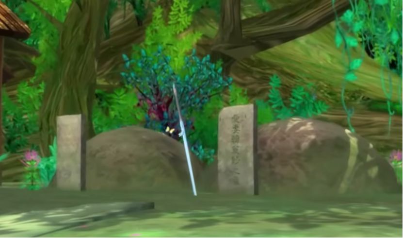 天河的木屋前堆着两座坟,一块墓碑上刻着“爱妻韩菱纱之墓”,望舒剑靠在一旁。