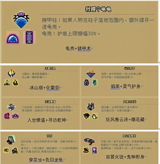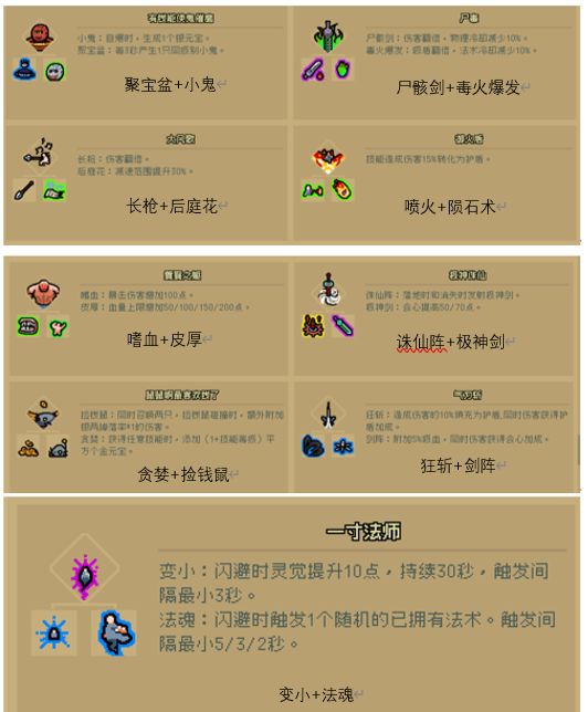 龙太子+凤凰女(登场时回复30%血和护盾) 小浪沉+ 飞凌锭(飞凌锭在指定位置生成一次小浪沉, 小浪沉造成的10%转化为护盾) 闪电链+黑球(闪电链每次命中产生一个同等级的黑球最小间隔0.5秒 ,黑球每两次释放提高一点移动速度) 挥砍+飞轮(挥砍范围提高,飞轮物理冷却减少) 贪吃羊+菜刀牛蛙(贪吃羊死亡时向8方发射羊豆,菜刀牛蛙死亡时向6方发射菜刀) 这些我没有只能打字了