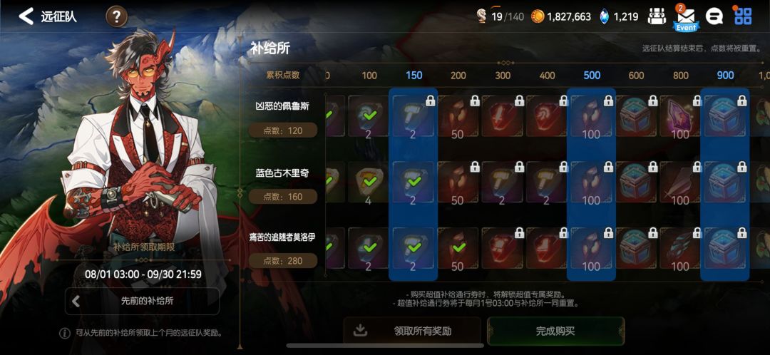那么远征不仅可以提供非常稀有【洗练石】,还另外有一个特殊的【补给所】系统,额外提供了许多丰厚的奖励,包括说我们装备需要的资源,重铸材料,传说装备强化石,【洗练石】选择箱子等等。其实就是一种通行证啦。