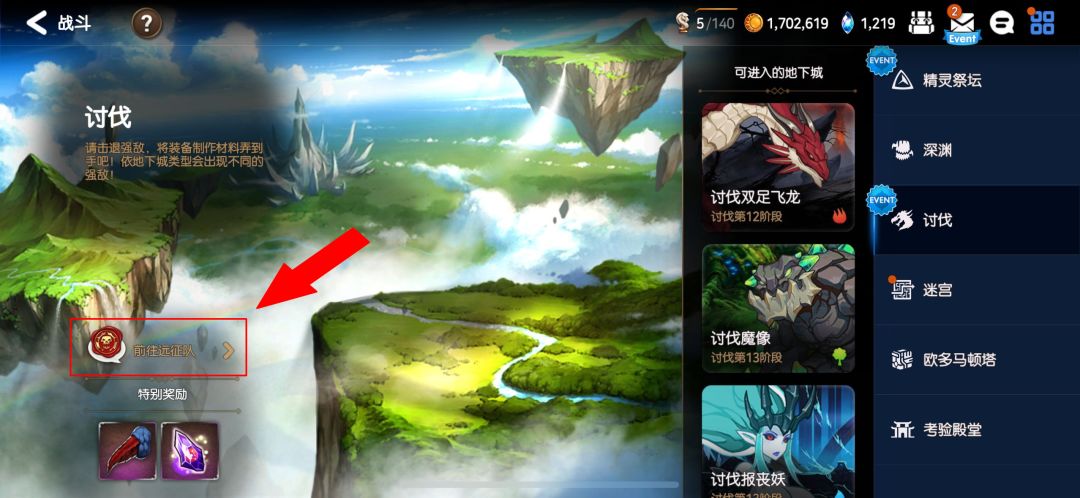 另外平时的时候有远征招募会在大厅的酒馆老板卡洛头上显示远征招募气泡,但是如果没有的话呢,我们也是可以通过战斗→讨伐进入远征界面。
