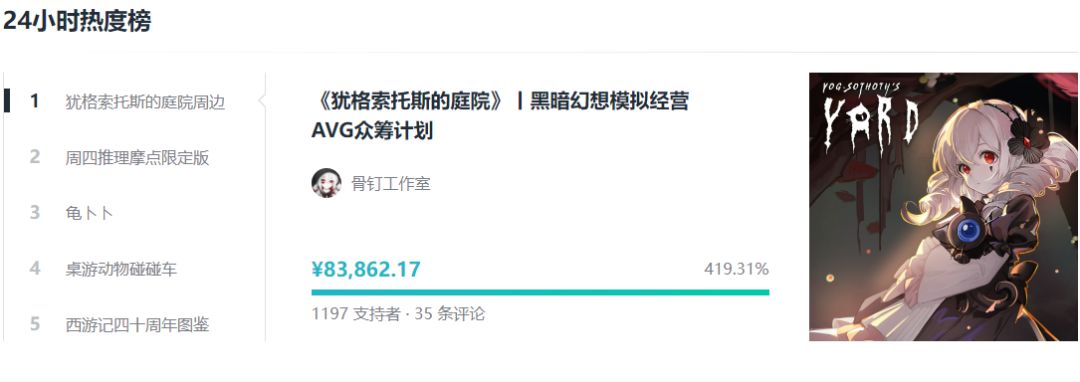开众筹啦!骨钉工作室研发的剧情类模拟经营游戏《犹格索托斯的庭院》昨日18:00在摩点开启周边众筹活动,仅仅过了3分钟便完成20,000元的既定目标,目前已解锁3w和5w元的档位,向着第三档10w元冲击,热度暂列摩点24小时众筹榜第1。