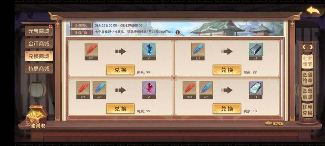 大家好~今天更新了七夕—牛郎织女关卡,同步也开启了活动商城兑换,里面可是有不少好东西呢~