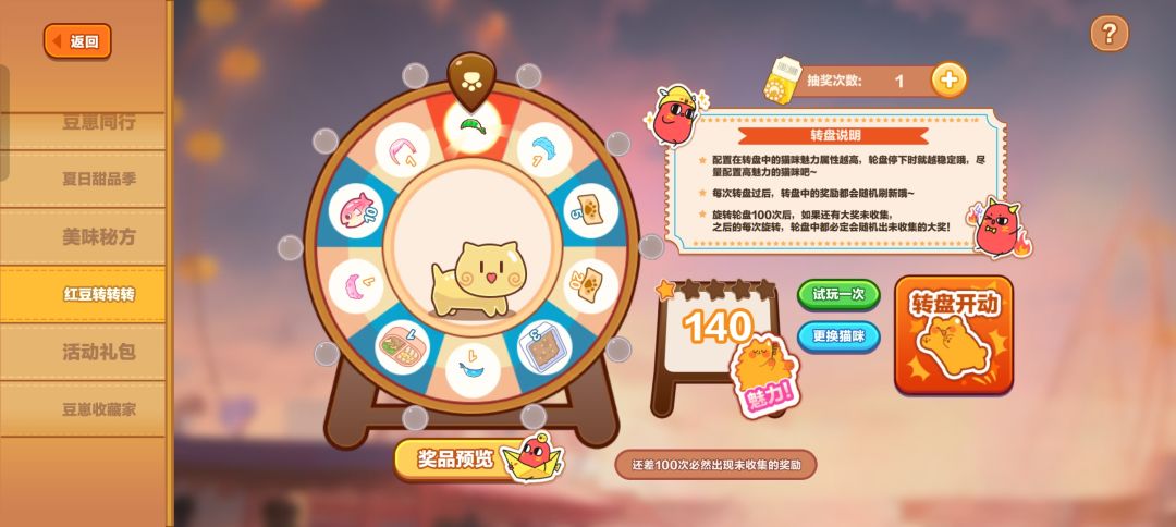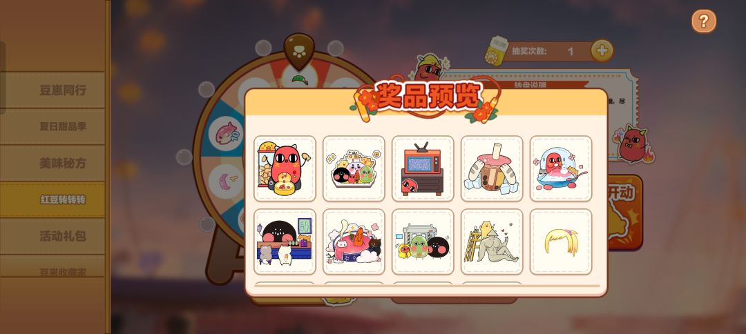 需要抽奖券抽取“联动花园装扮”9个及“豆崽皮肤装扮”5个,需要养一个高魅力值猫咪(红小豆或其他),可以让转盘更稳定,避免抽出大量垃圾