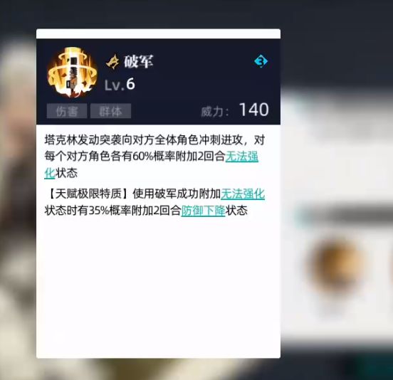消耗3个能量的3技能是群体伤害,概率让对面无法获得强化状态(封强),天赋的3技能成功封强的话概率降低对面防御。