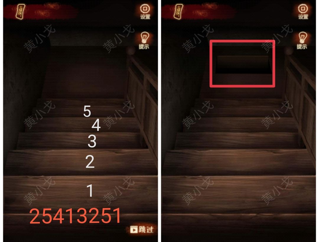 1.(楼梯)注意脚印👣亮的位置和顺序,按顺序点击木板(从上到下:25413251)。暗道的门打开