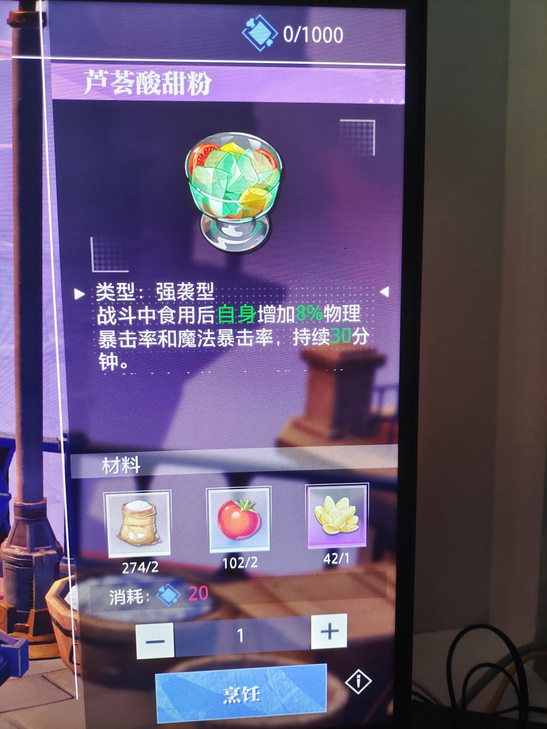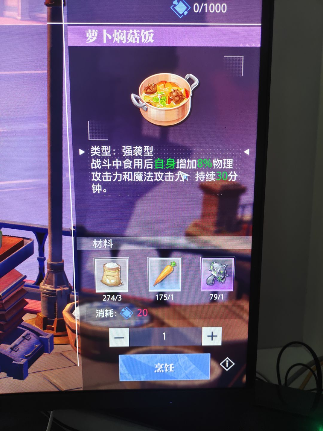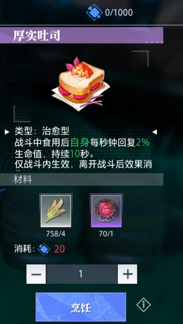 首先我们要明白精力是什么,点开你的头像在右边就会显示精力值,每天更新1000点。我们可以在游戏里通过野外采集,制造以及烹饪来消耗我们的精力。