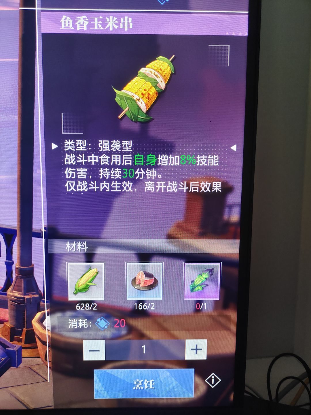 接下来是重点!兄弟们一定记住!大号的精力,我建议野外采集+灶台烹饪,因为烹饪的食物能够大幅度的提升你的实力,团本里边吃两口,不猛C你直接喷我!不相信的可以看我上一个视频帖子,20武器单秒精英人马。