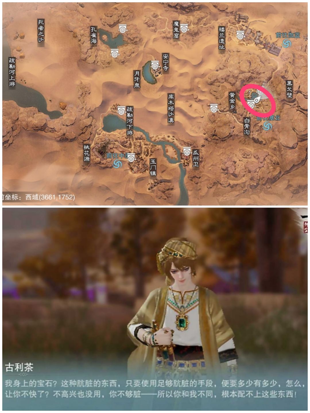 一梦江湖中的npc人物,可以送礼、互动来提升他们的好感度,并且有些npc还是触发奇遇的关建人物。那么这么多的npc,大家该怎样才能找到他们呢,他们的坐标位置又在哪,下面就先来看看伽蓝NPC的位置吧!古利茶:西域黄金乡(3660.1752)