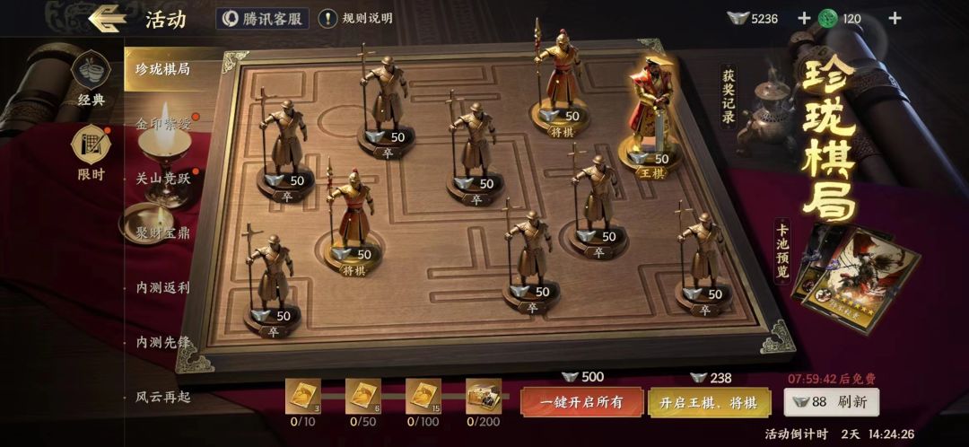 2. 天下大势小卡包:每个天下大势都会有一个小卡包,其中3个金卡,每个小卡包可以免费50抽,这个卡包没有保底,可能50抽3金4金,也可能50抽0金,如果免费的50没出货,每个卡包还能抽200次,单次200银,是大卡包抽卡价格的2倍,这些卡包里面会有一些当前大卡包没有的金卡和技能。