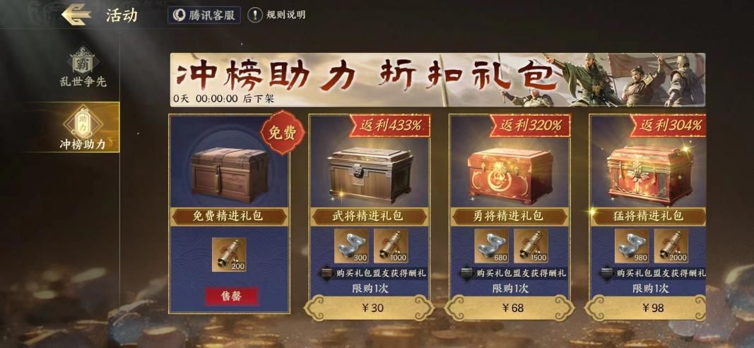 礼包种类:1. 限时礼包:武将助力和建筑助力,前者是抽到新武将出现的,30块钱一个,平民小氪都可以忽略,建筑助力每次升级大本后出现,6元到98不等,这个可以根据自己实力考虑,滚雪球必备。