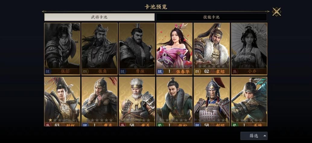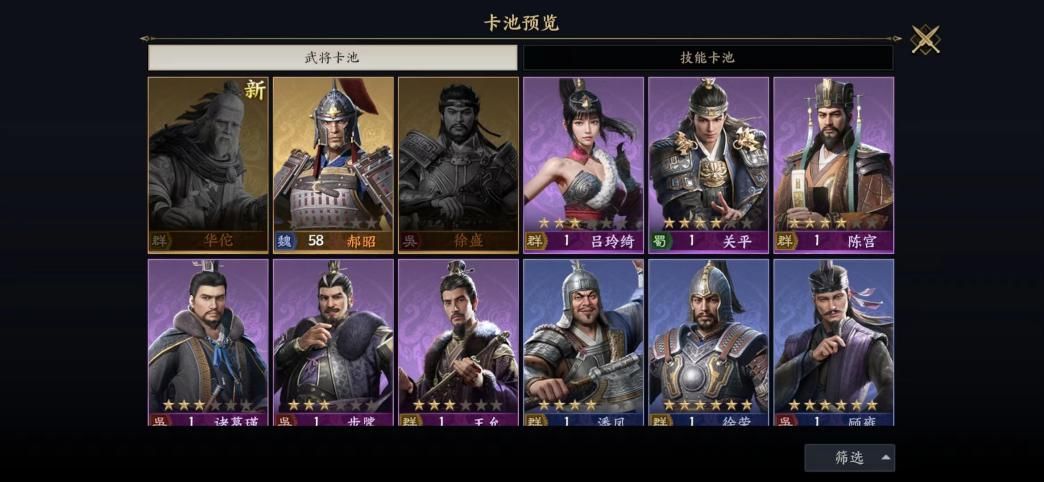 1. 大卡池招募:初始大卡池不建议抽太多,因为其中的武将和技能核心位非常少,核心虽然不锁卡,但是暴率低,抽到的大多数都是边角和饲料,不建议用银币去怼这个卡池,性价比极低,抽数是50抽保底1金,当然保底几率也低,基本平均20-30抽1金吧。
