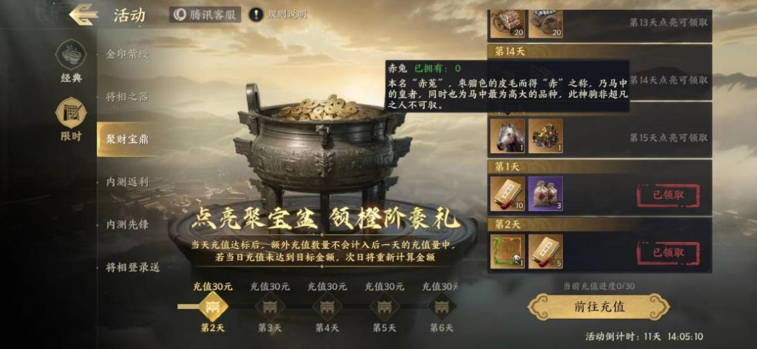 另外强调一下,游戏中有一个活动聚财宝鼎,每天冲30,累计15天,每天都有奖励,第十五天有金马,这个基本属于必做的活动,金马的收益非常高。