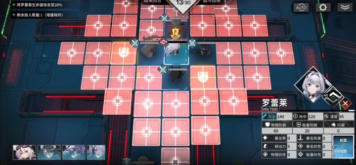 如图,boss没有闪现之类的移动技能,她的攻击范围又打不到周身四格,那我们只需要四个近战输出把她围住即可保证她只有aoe技能可以输出,且只有一个人会被打中,强制出场的奶妈足够奶回boss的aoe打掉的血,奶妈被bossa一下也不会死,下回合拉出去自奶或者直接二技能远距离奶伤员都可以。第二个小寄巧就是等一阶段打完boss后,二阶段可以直接用影这个四星角色的技能把boss送到回复地形上,下回合boss自动回复就会达到任务要求的血线,不用让奶妈在那奶个二十回合了(血泪)。