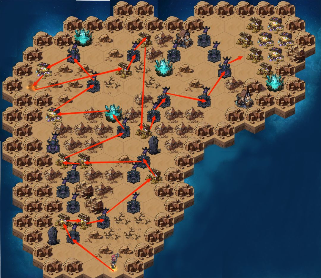 “楼兰古城”按以下路线图走即可通关,路线图包含爪牙挑战、宝箱拾取和激活机制。