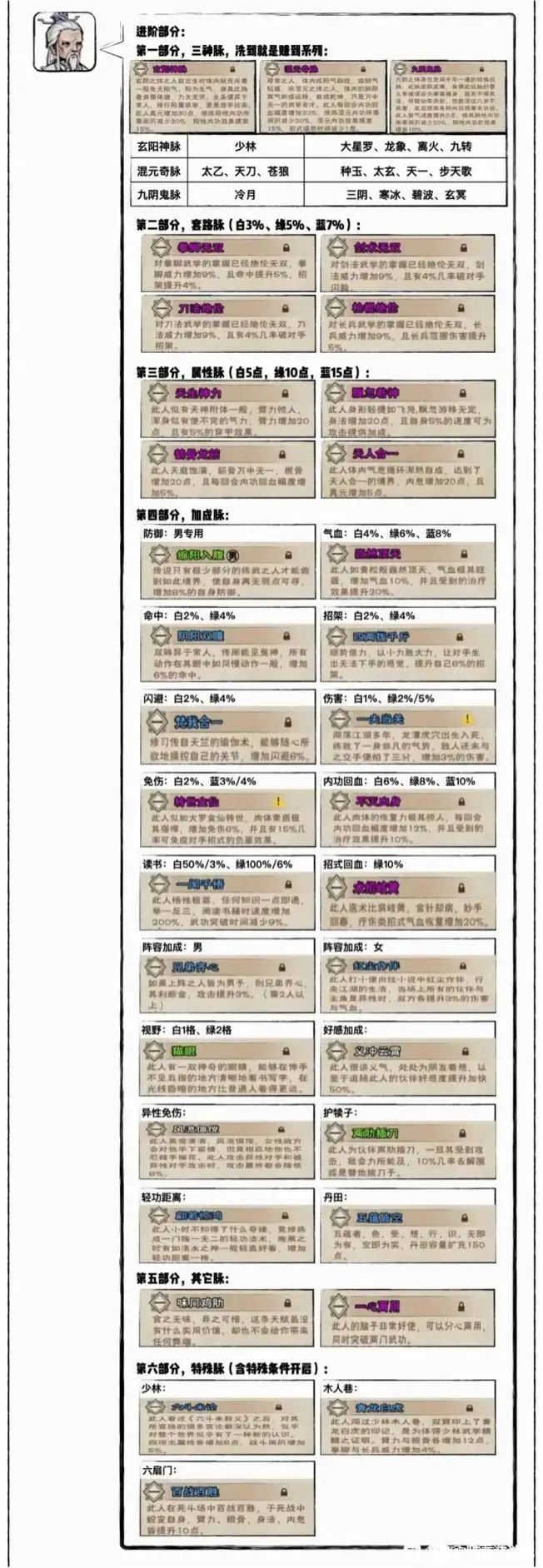 加150真气上限,发育不错,但是对真气上限能预算毕业的玩家来说,食之无味,弃之可惜,比如我,目前是1340上限,890等级加成,300经络论胎息术,再加上主角的经脉150,随从开着加速,据我所知,没记错的话,奇经八脉上限是1750,我90级就是1350,二队三个150就是1800,绰绰有余,但是这玩意儿在没有能力达到上限前用着挺不错,少林可以用用,毕竟大光明灌注真气,之所以弃之可惜,是因为开了这个天赋,主角就能把经脉上限换成加速,但感觉亏了一个天赋位。