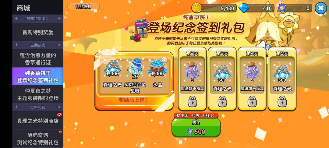 【真理之光特别商店6元礼包】、【纯香草登场纪念签到礼包】、【纯香草登场纪念礼包】、【饼干登场纪念礼包第1期】、【酥脆奇遇测试纪念扭蛋礼包第1期】、【成长礼包-活力新手礼包】、【魔法饼干模具特别礼包】