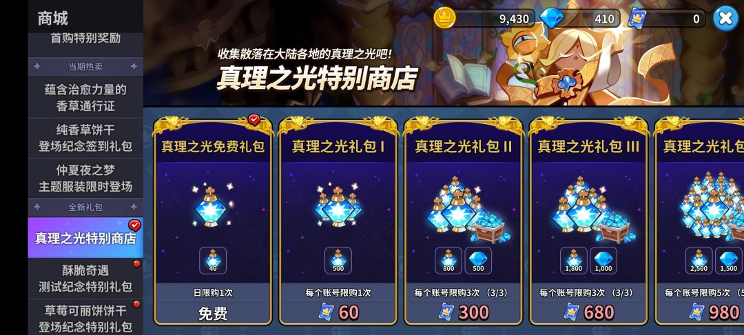 这部分主要给大家推荐一些有一定性价比的抽卡礼包,想在前期尽快获得更多饼干的饼干可以选择购买,其中建议大家优先购买有更多“真理之光”的礼包,毕竟上古还是比超稀有饼干要更有价值的~早点抽出纯香草会让你的游戏体验好上一大截!这里列举了一些带有真理之光的礼包,大家可以按需购买~