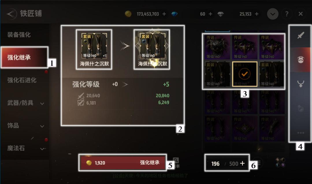1. 在铁匠铺中选择[强化继承]选项,即可进入继承界面。