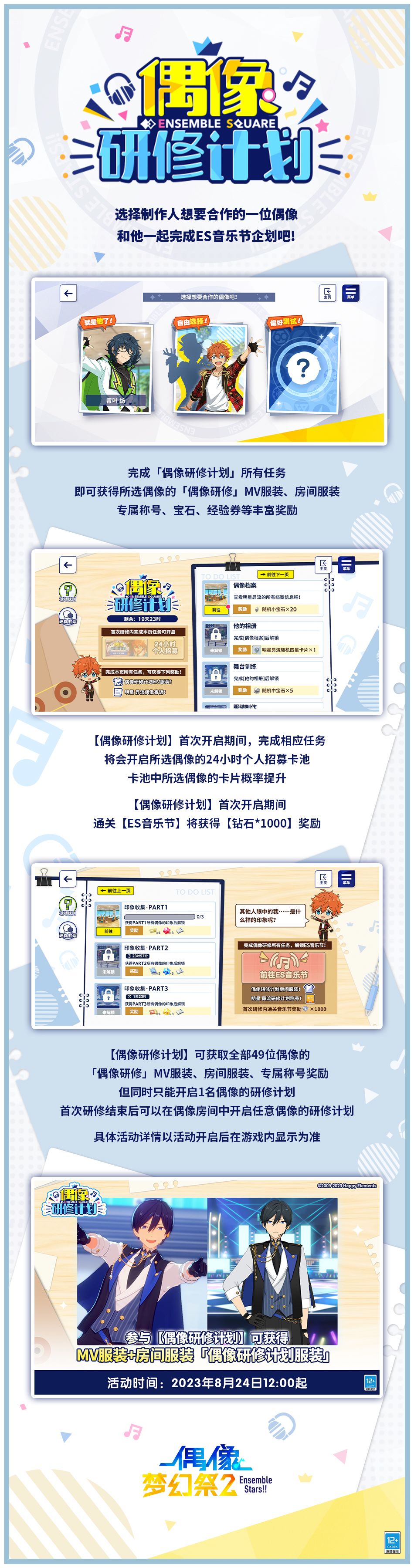 8月24日12:00起,制作人等级≥10级的制作人在活动开启后首次登录游戏即可收到信件邀约,开启偶像研修计划。每次研修时间为20天,若研修时间结束未完成该偶像的研修计划,也可以在偶像房间内再次开启,研修进度将保留。