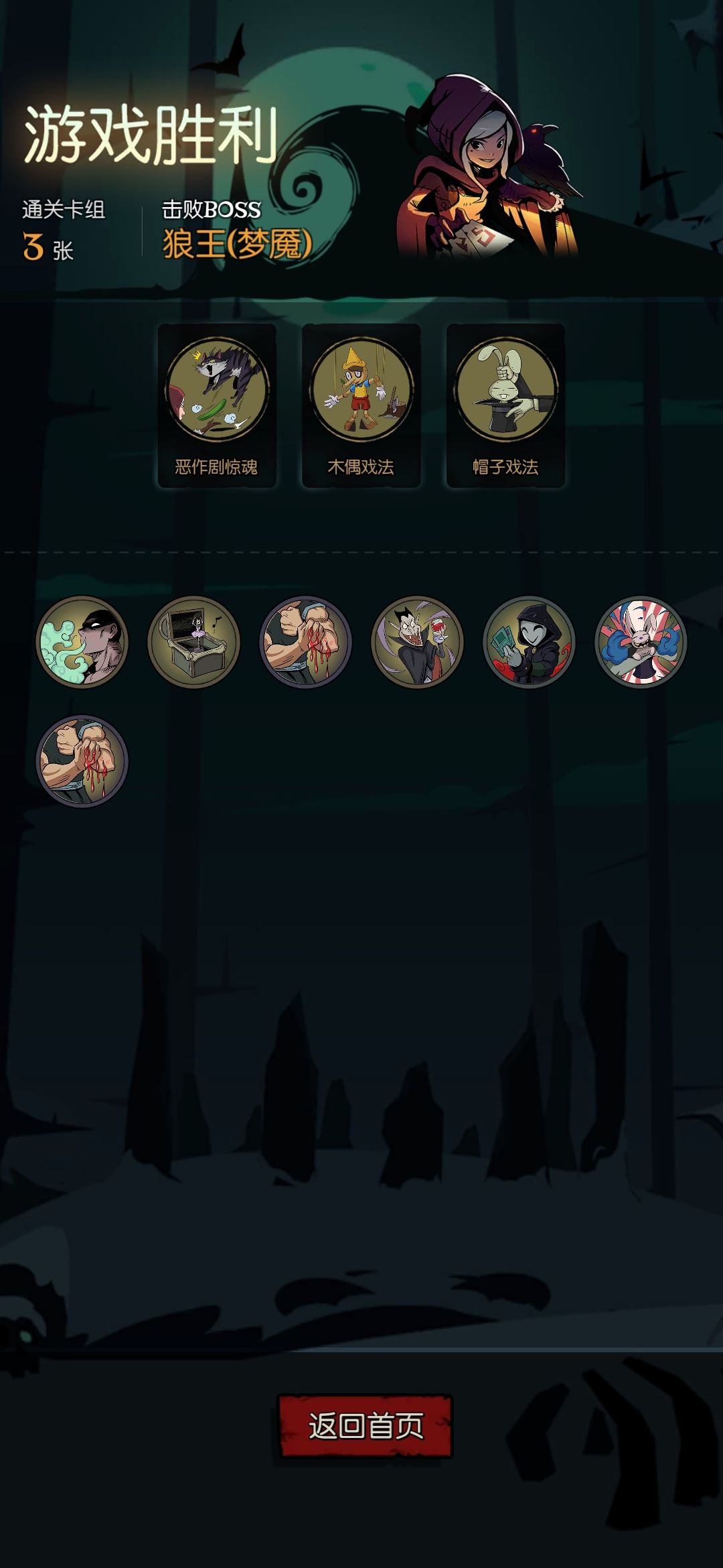 思路,用木偶戏法复制帽子戏法,帽子戏法复制恶作剧惊魂,每回合都留一张帽子戏法来复制,除了无头,其他都是闭眼睛一到二回合过,船长需要留一张飞镖打掉反伤然后开技能复制木偶戏法一回合杀掉船长。