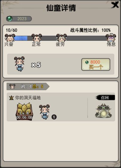 起始阶段你的“福地洞天”会分配有1个仙童和5堆资源