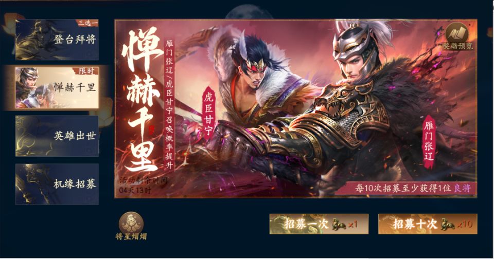 限时卡池“惮赫千里”现已开启,雁门张辽、虎臣甘宁上线!活动持续5天,想招募这两位名将的主公们请千万不要错过这次机会!