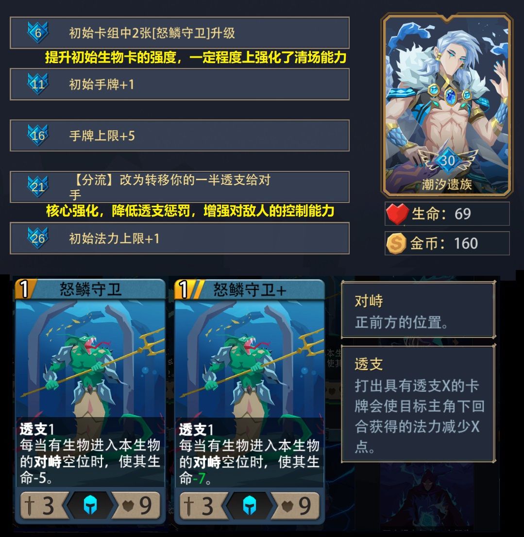- 中期尽可能地获取核心卡,至少要形成鱼人三兄贵的组合,变换初始的1费守卫和退化卡,运气好就变成【海潮涌动】