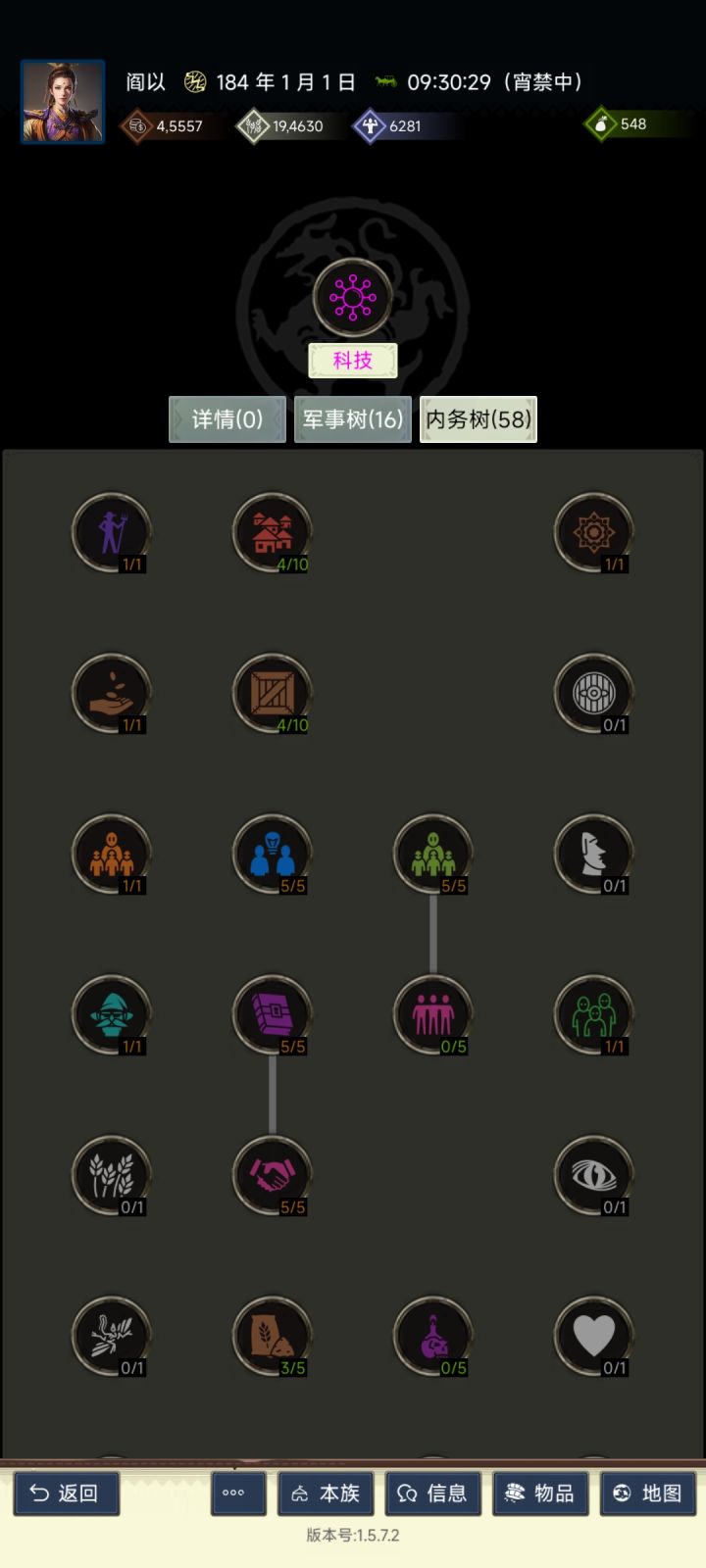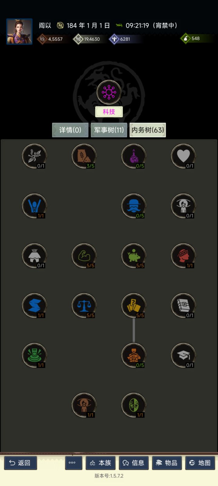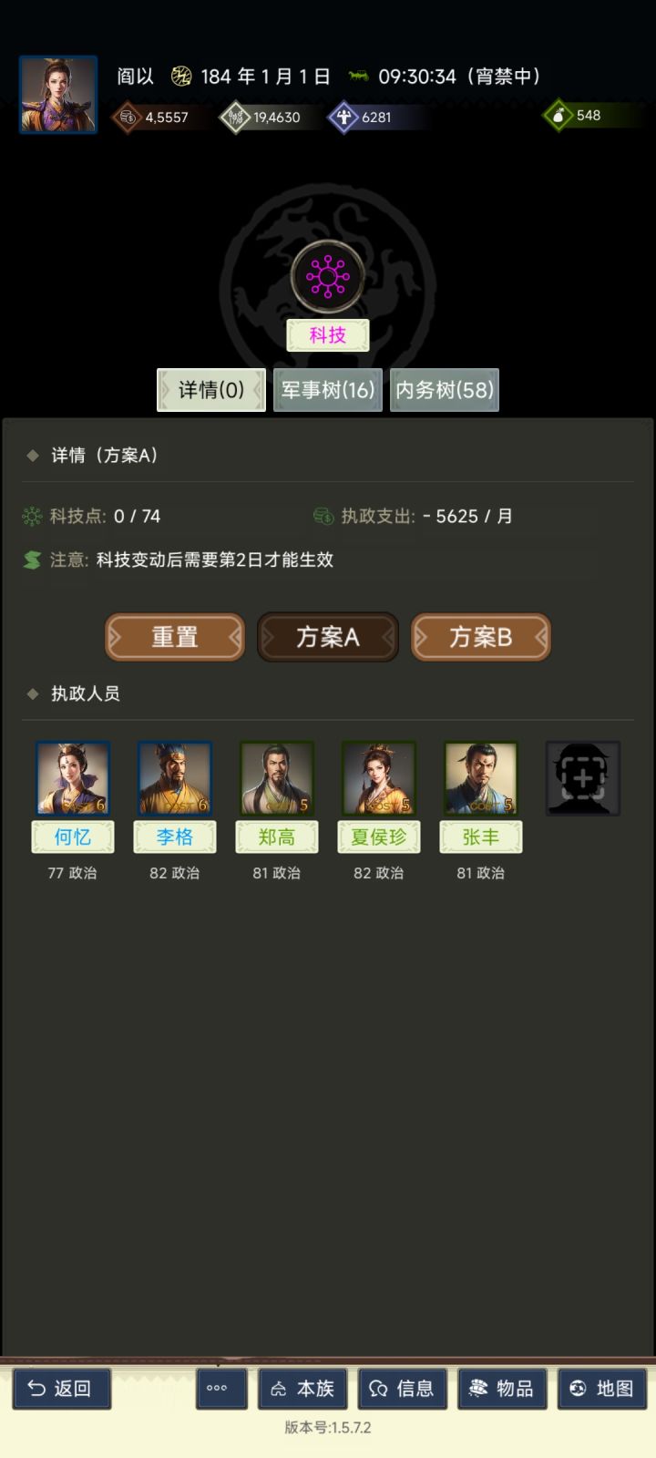 等发育差不多了可以慢慢补上科技人员,内政中金钱加成>壮丁加成>粮食加成>其他