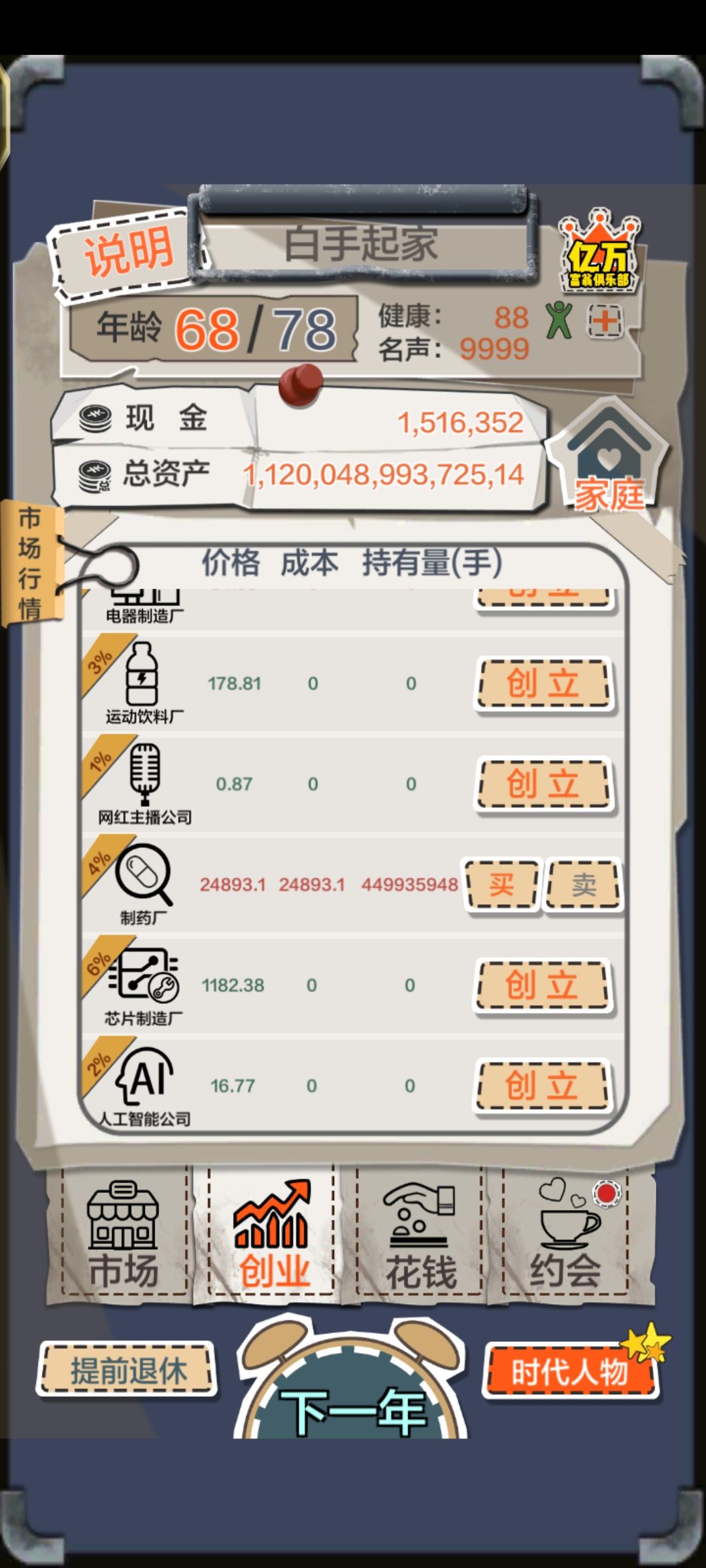双球队的加持下制药厂基本每年都会涨,记得每年留一股卖出再买回来。在运气正常情况下玩到结束,应该就接近18位了,不到的话就冲一波彩票,到了的也可以冲一波彩票。