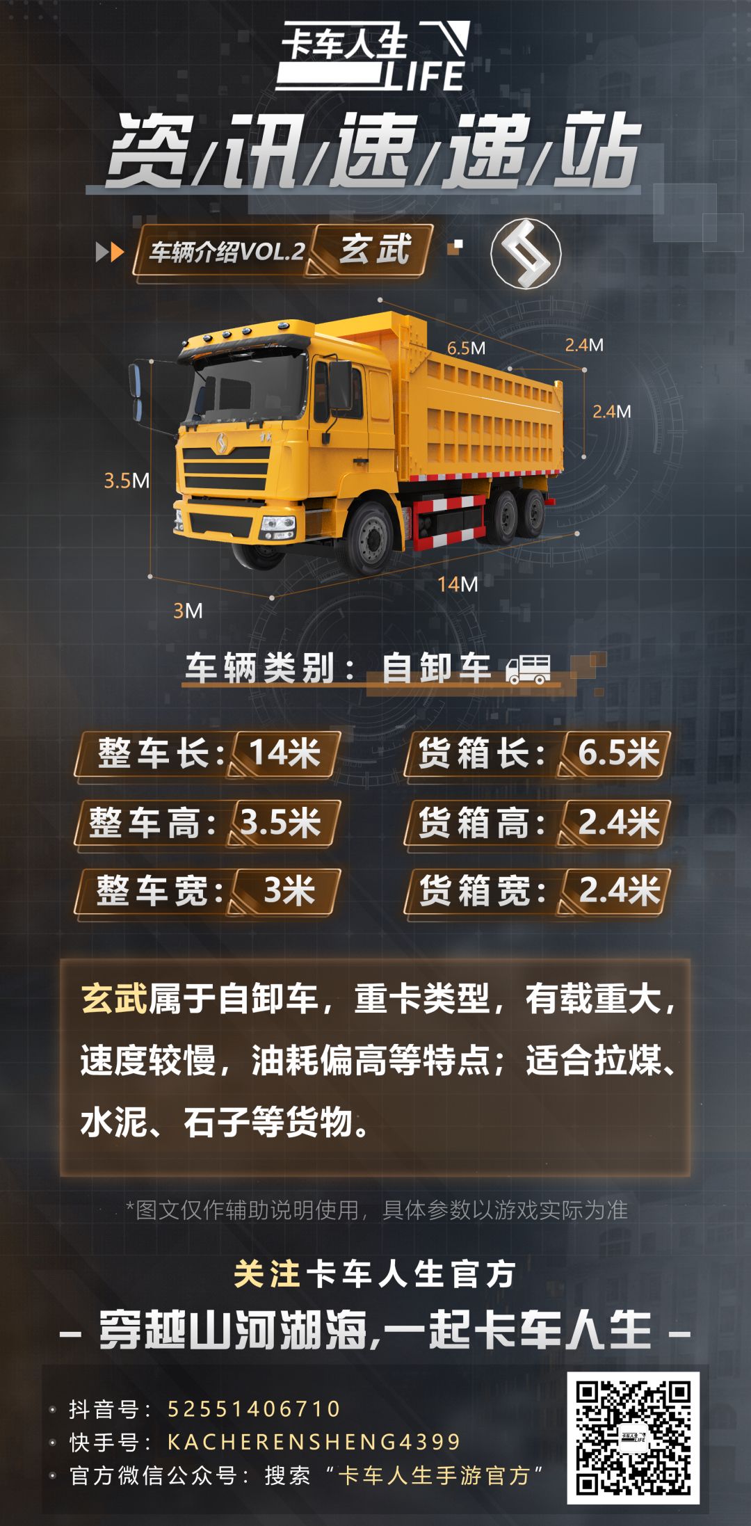 “玄武”,作为《卡车人生》中的经典自卸车型,以更短的车体与双后轮的稳定结构,能够让它能在有限的承重范围内尽可能地多拉货物,让整个车体呈现出车如其名“玄武”一般的稳定感。其较为泛用性的特征让它在物流工作上总拥有一席之地,不仅能承载水泥等的流体类、石子等的颗粒类物品,还能通过车厢底部的机械/液压举升自行卸货,省去了搬运货物的烦恼。