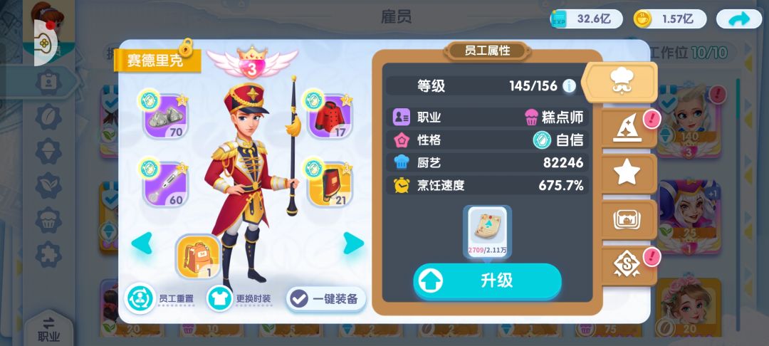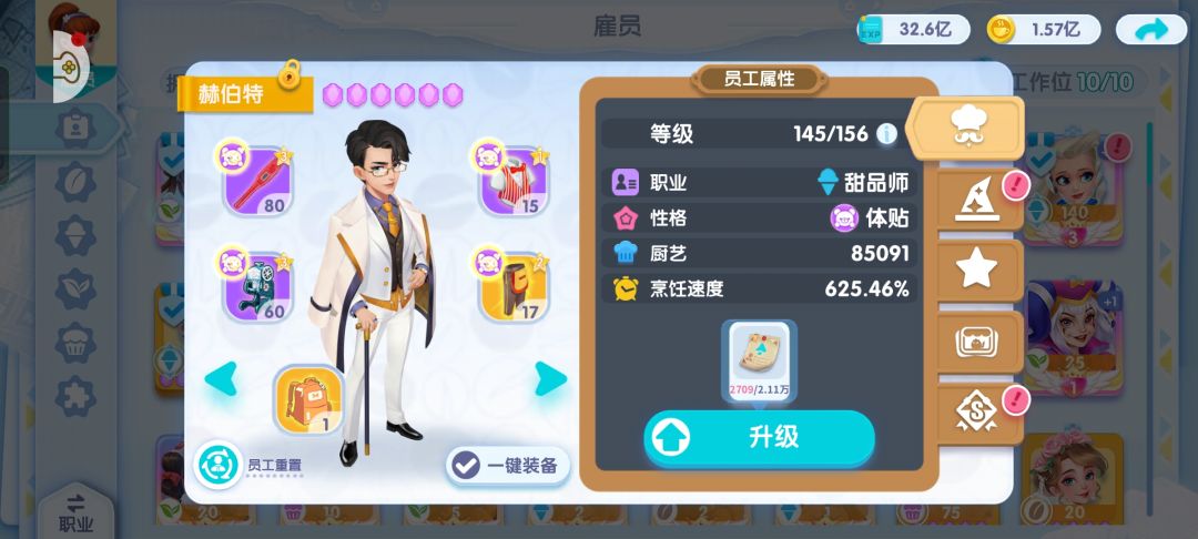 表现在员工上,六钻的赫伯特实际工作厨艺高于3冠的塞德里克,也比同样是甜品师的六钻米塔高出不少,而同样性格的米塔,也比塞德里克高出来一些装备分和甜品师加成……