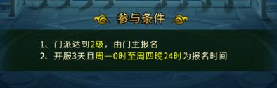1、角色无等级要求,只需开服3天且门派等级达到2级,由门主报名。