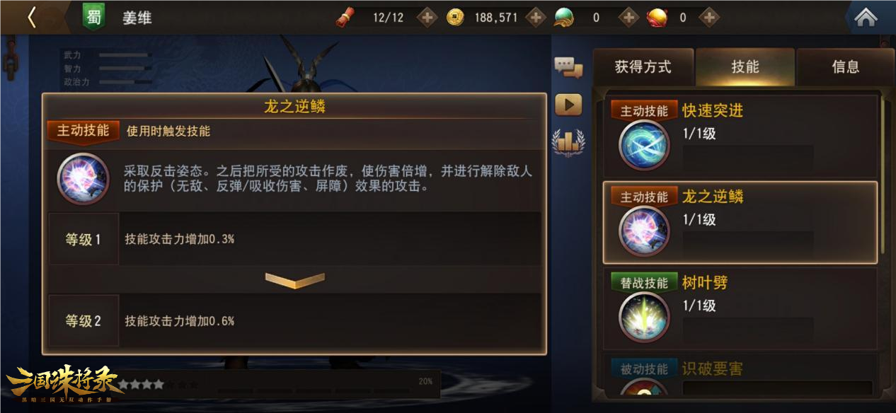 姜维主动技能【快速突进】、【龙之逆鳞】为攻击、增伤效果,可以在短时间内打出高爆发伤害,是主公们扭转战局时的关键。