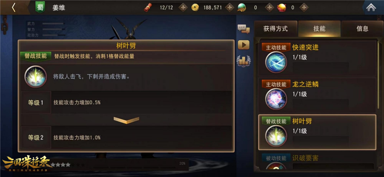 在《三国诛将录》中,主公们可以通过登庸商店将姜维纳入麾下。与以往一样,姜维的游戏技能也十分贴近历史形象,不管是主动技能还是被动技能,都以攻击、增伤为主。有如此勇猛的大将冲锋陷阵,主公定能成就霸业。