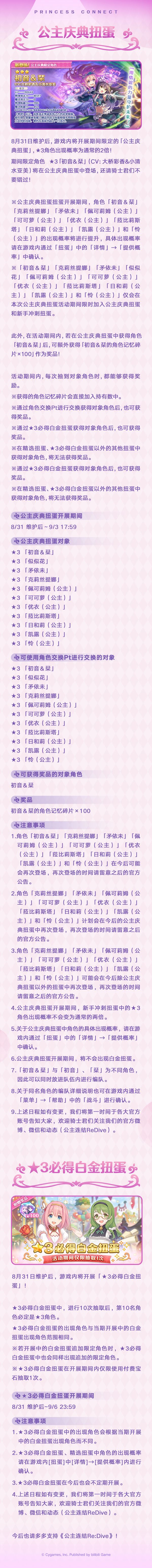 维护结束后,游戏内将开启★3角色出现率2倍的「公主庆典扭蛋」,期间限定角色★3「初音&栞」(CV:大桥彩香&小清水亚美)及公主庆典限定角色将在「公主庆典扭蛋」中限时登场,游戏内将开展★3必得白金扭蛋;同时,「★6才能开花」将追加新角色,并追加新的游戏内容!