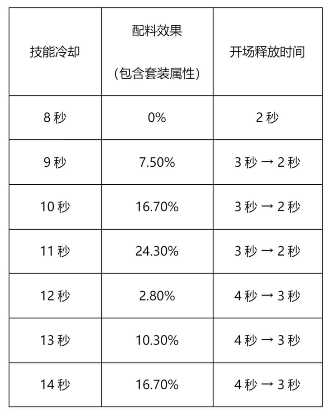 当饼干技能冷却时间是15秒且自身没有任何冷却加成时,开场技能时间为4秒,但是当自身的冷却数值达到22.3%时,开场技能时间便会到3秒。