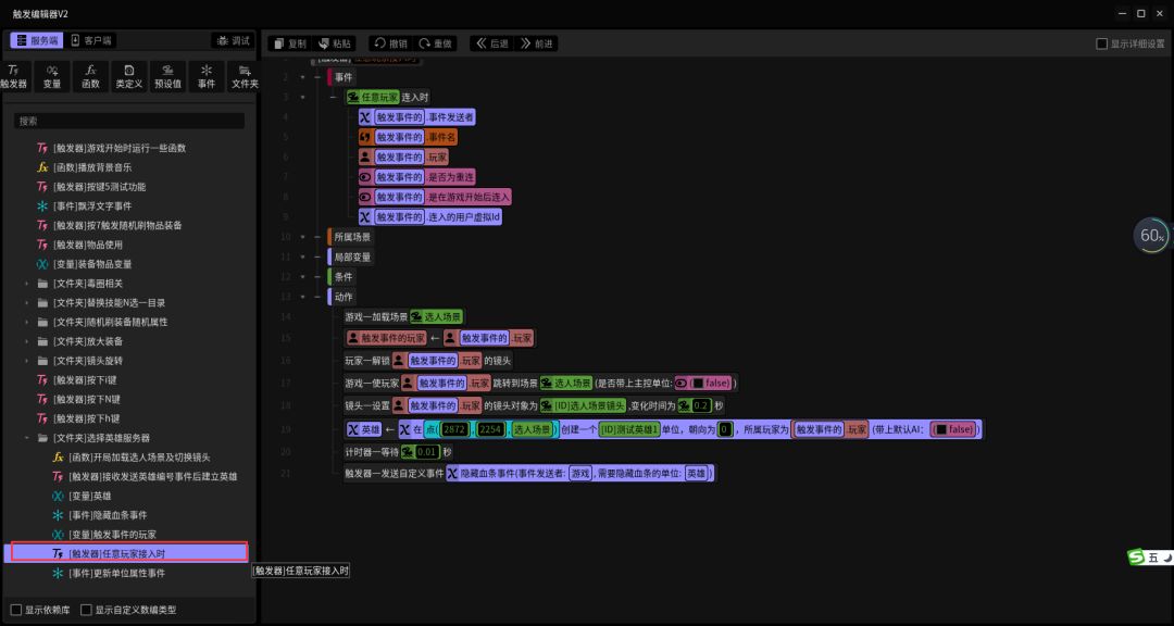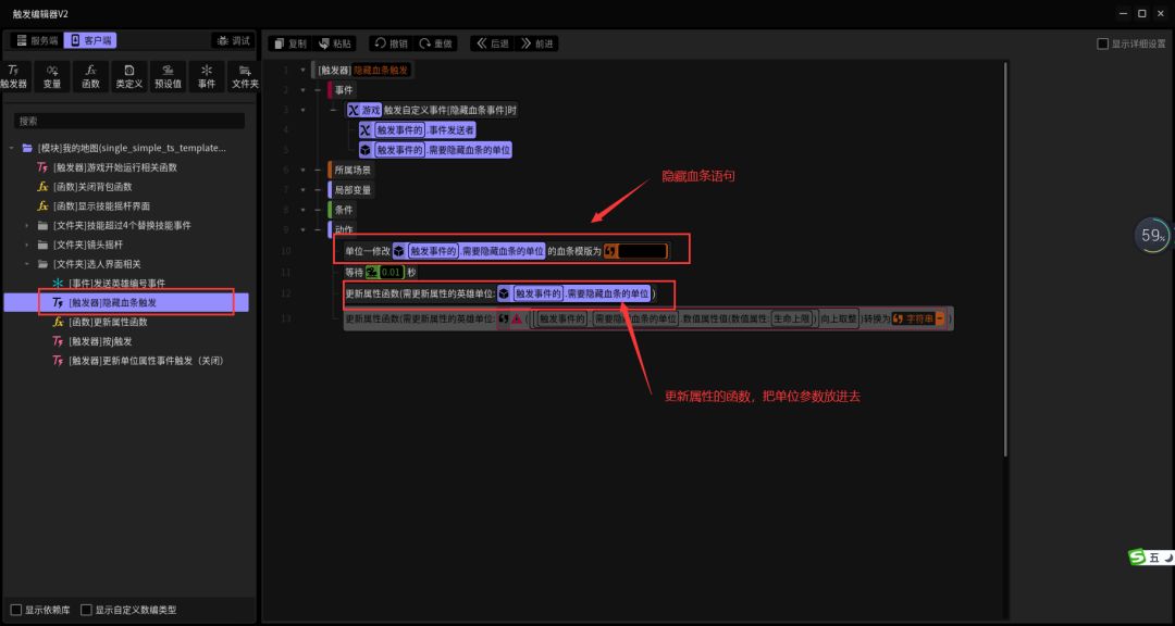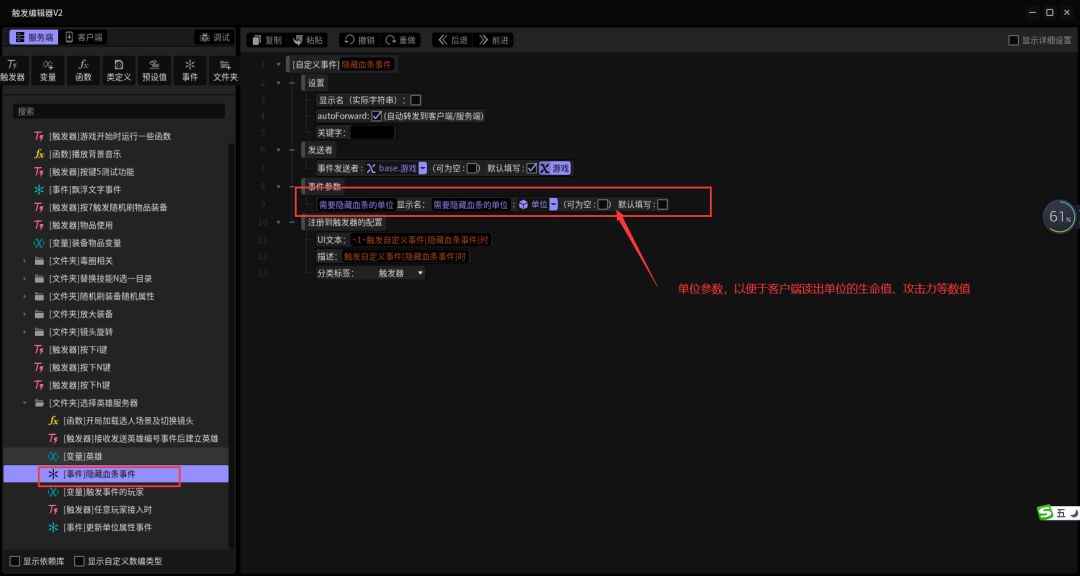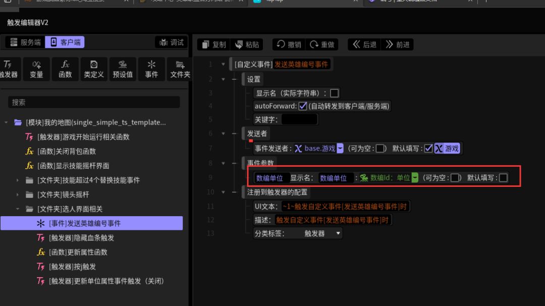 上图的是触发器内容,在服务端,因为创建英雄需要在服务器端实现,因为创建出来的英雄有血条,所以加了个隐藏血条的自定义事件,在后面发上来。