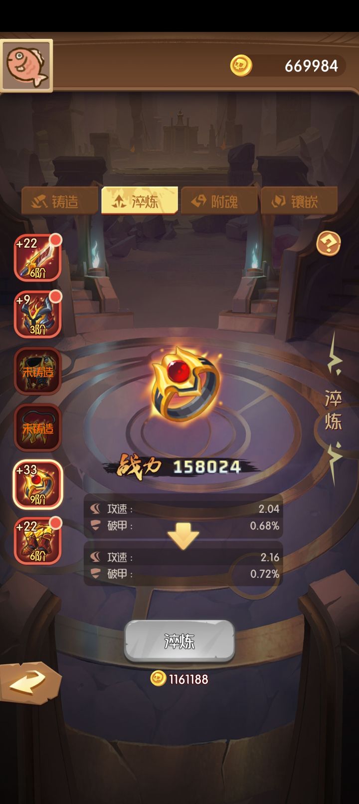 ,祝你们每次激活,重铸都是自己想要的词条。神器淬炼,优先选择基础数值带有攻速,破甲的神器,比如戒指,衣服,项链,攻速可以提升大量伤害,破甲越高越好破甲达到100可以无视防御。,后面淬炼攻击比如武器,鞋子,。最后剩一个帽子,淬炼不淬炼都行,没啥用,帽子只有稀有词条厉害,基础不行。