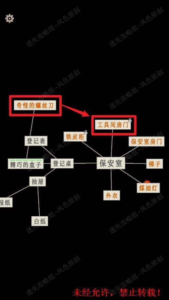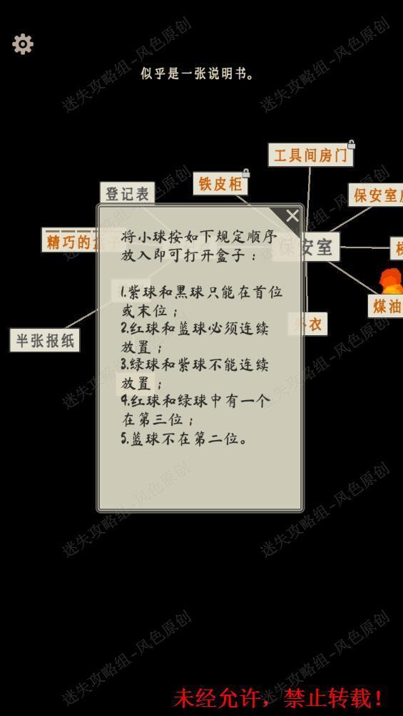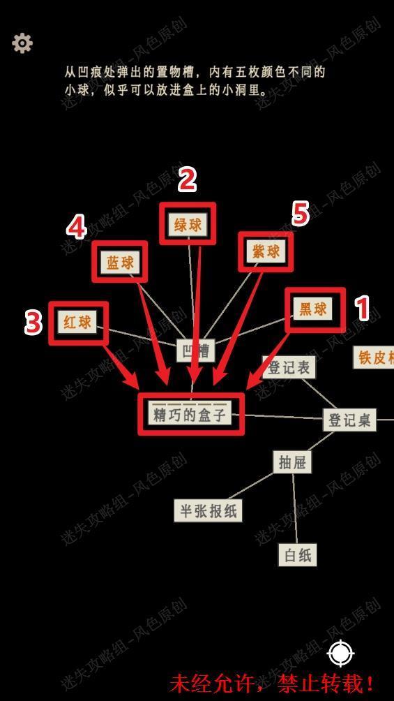 58.点击【登记桌】中的【精巧的盒子】→【凹槽】,获取红蓝绿紫黑五个球体,根据【白纸】上的线索提示,可知正确的顺序是黑绿红蓝紫,按照此顺序将五种颜色的球放入【精巧的盒子】中,获取【奇怪的螺丝刀】。 58