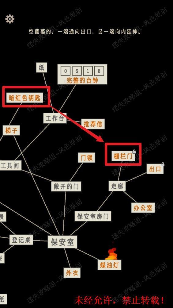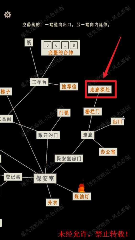 64.使用【铁皮柜】中获取的【暗红色钥匙】打开【保安室房门】→【走廊】→【栅栏门】,点击【走廊深处】。 64 64.1