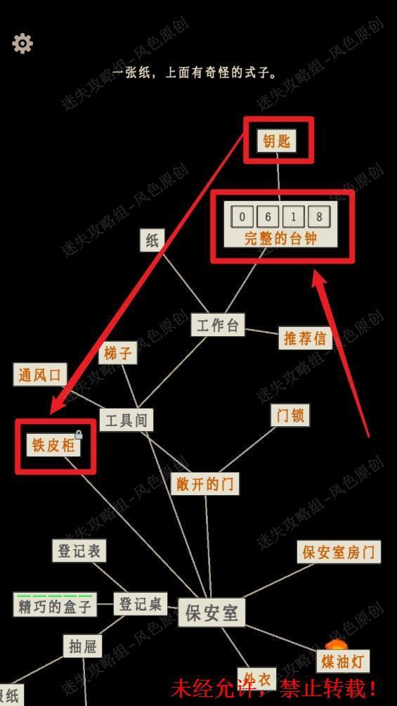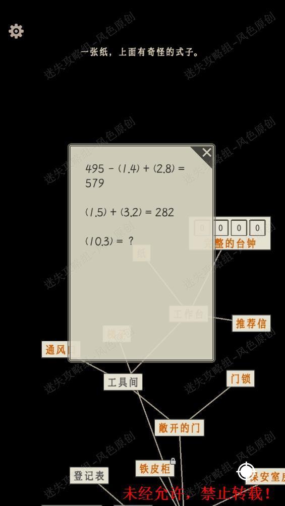 63.点击【完整的台钟】,根据【纸】上的密码线索提示,可算出1为60,则10.3为618。因为台钟上的密码为四位,所以密码为0618。输入密码,获取【钥匙】,并使用其打开【铁皮柜】。 63