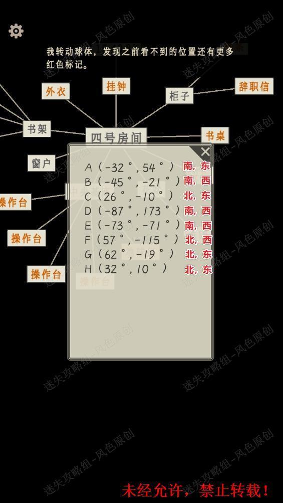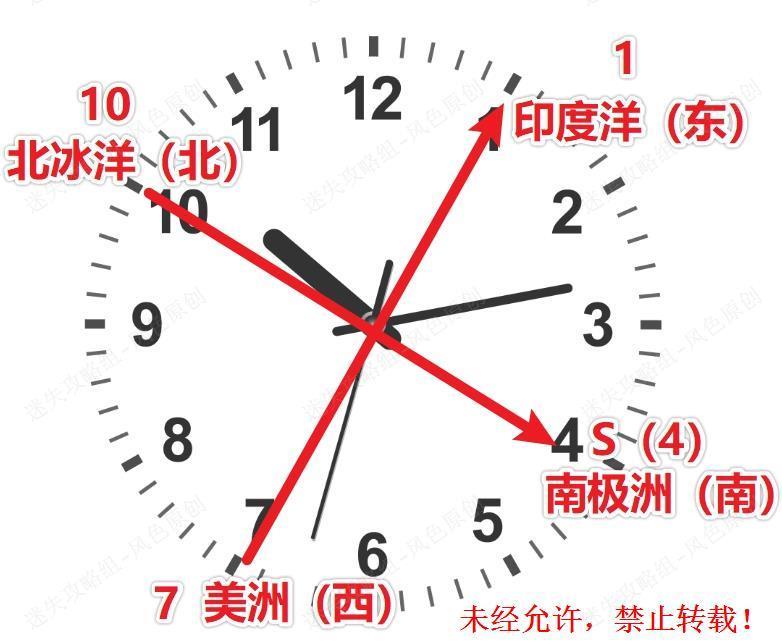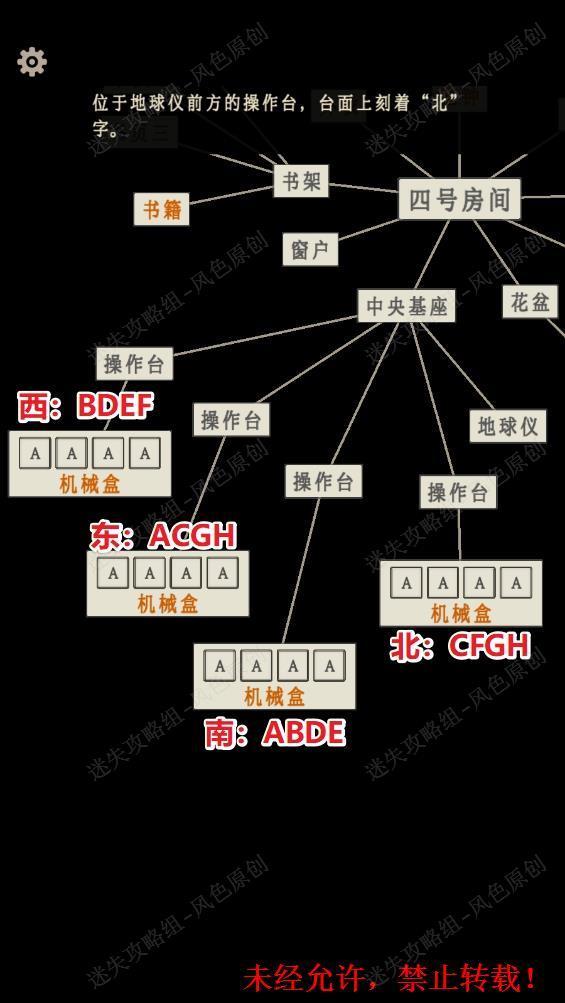 127.四个标注有东西南北的【操作盘】对应的即是东西南北半球。根据步骤125确定的各个坐标的字母所代表的方位与顺序,在四个对应的【机械盒】上调整为正确的密码即可。