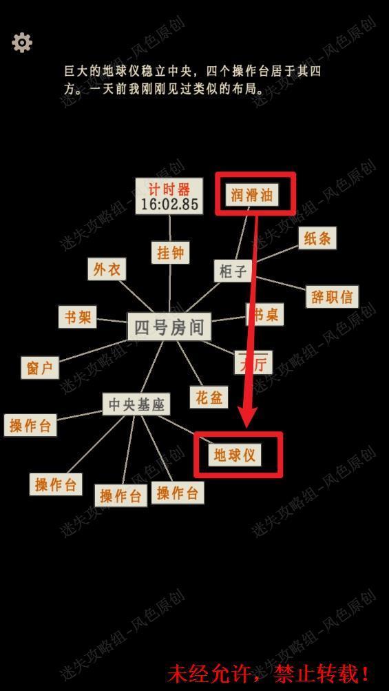 121.点击【柜子】找到【润滑油】,点击【中央基座】找到【地球仪】。将【润滑油】移动至【地球仪】上。 121
