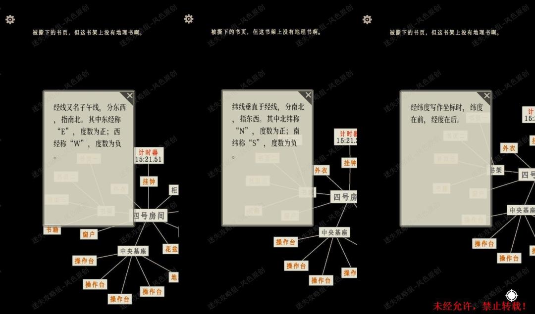 122.点击【书架】,阅读【书页1】,【书页2】和【书页3】,获取有关于经纬度的先线索提示。 122 122.1