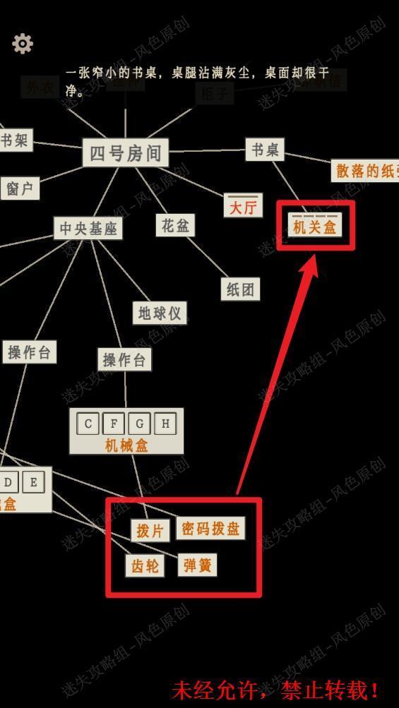 128.点击【书桌】,找到【机关盒】。将四个【机械盒】中解锁出的【拨片】,【齿轮】,【弹簧】与【密码拨盘】移动至【机关盒】上。再点击【机关盒】,触发出五位密码。 128 128.1