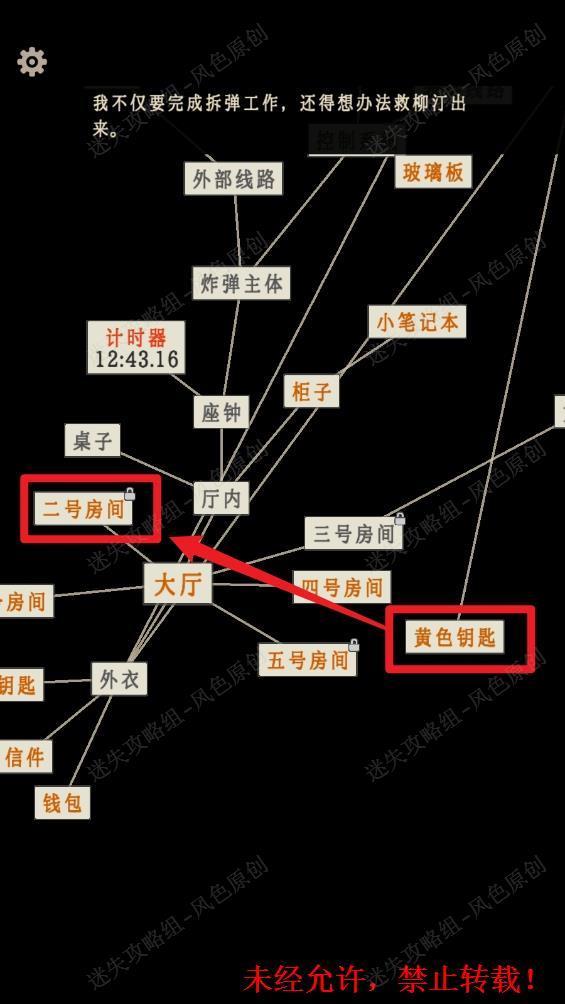 140.将【黄色钥匙】移动至【二号房间】上,解锁后,再点击一次【二号房间】。 140