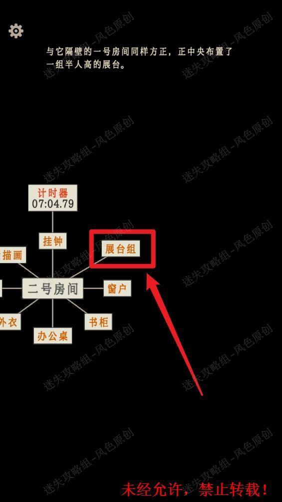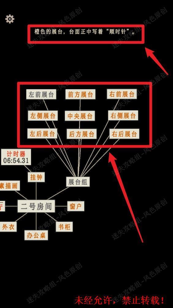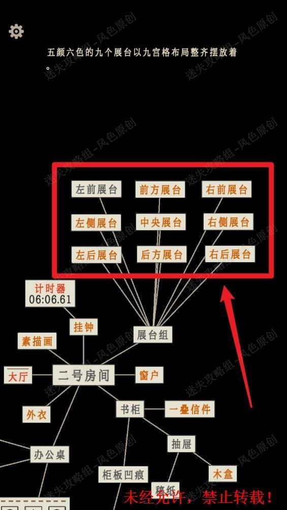 143.可触发出九个展台,如下图所示,按照展台的方向来进行摆放。点击展台,上方会出现颜色与方向的提示。 143